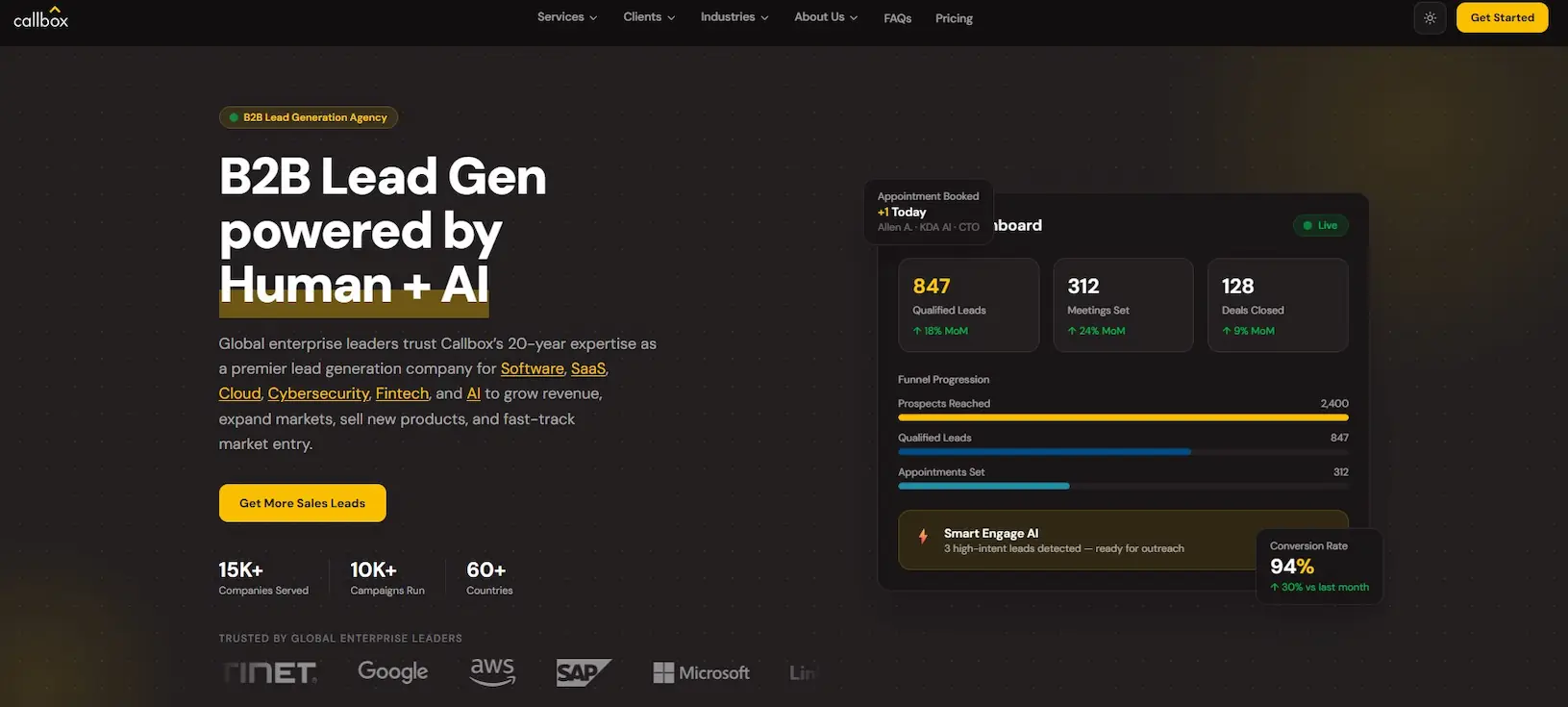 - Differentiator: One of the most established and recognized full-service appointment-setting agencies. 95% client retention. “#1 ranked appointment-setting agency” positioning. 14-day campaign launch with first appointments in 30 days. Claims $2B+ in client revenue generated since 2017.