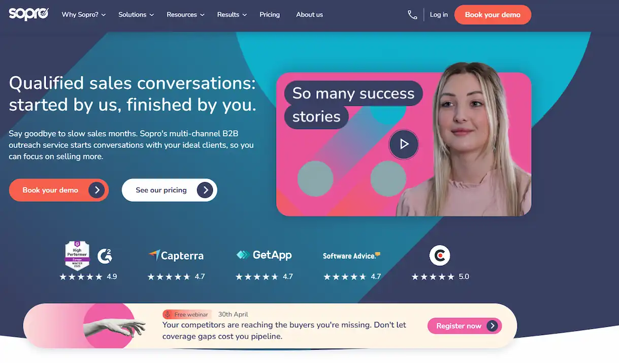 Audience Adsync is also a quietly powerful idea: it lets a client run paid retargeting and social ads against the exact same prospects Sopro is emailing, which closes a loop almost no competitor closes properly. The vertical-specific landing pages (saas, agencies, recruitment, training, finance) are a textbook example of how to scale category authority without becoming a generalist.